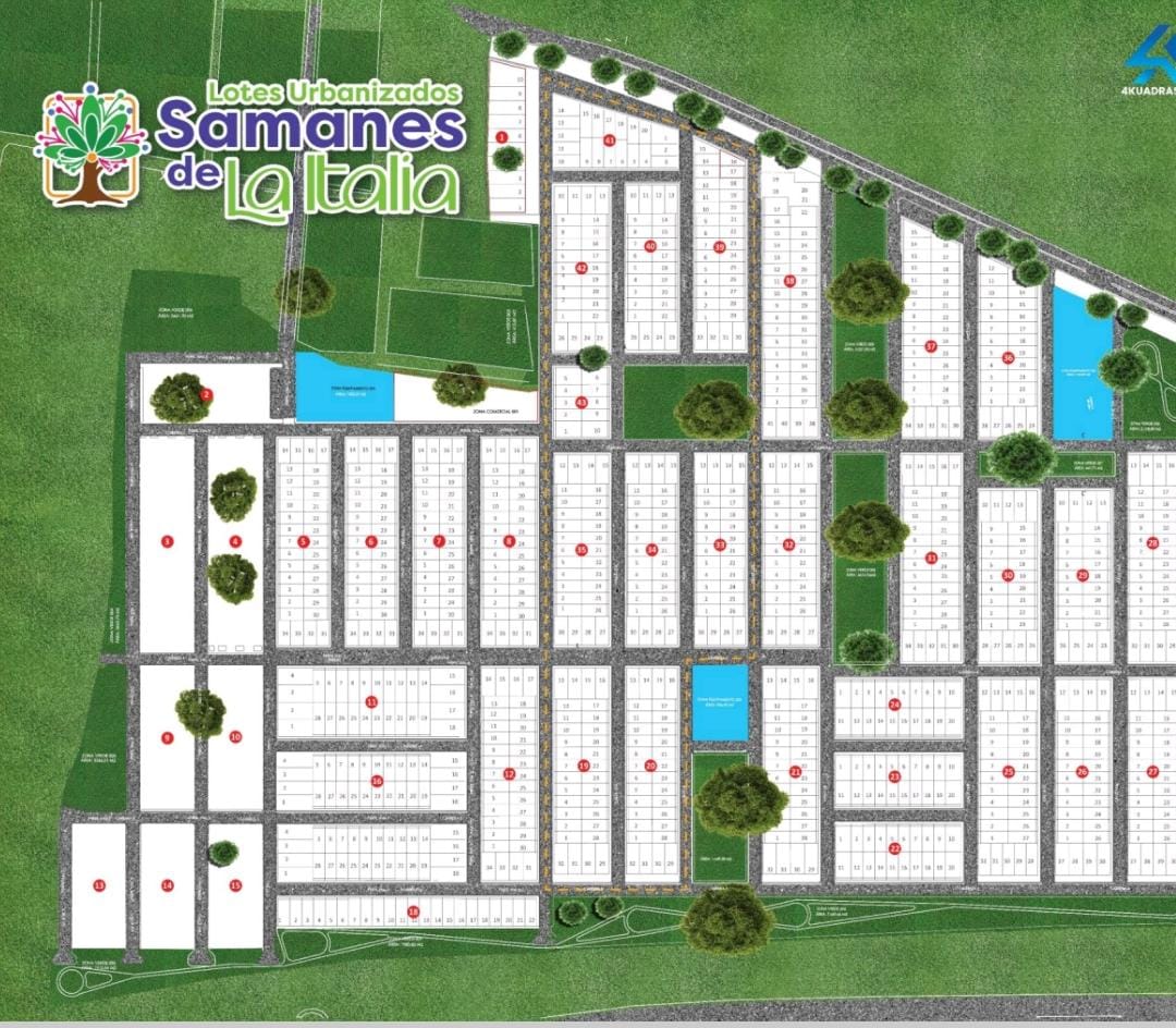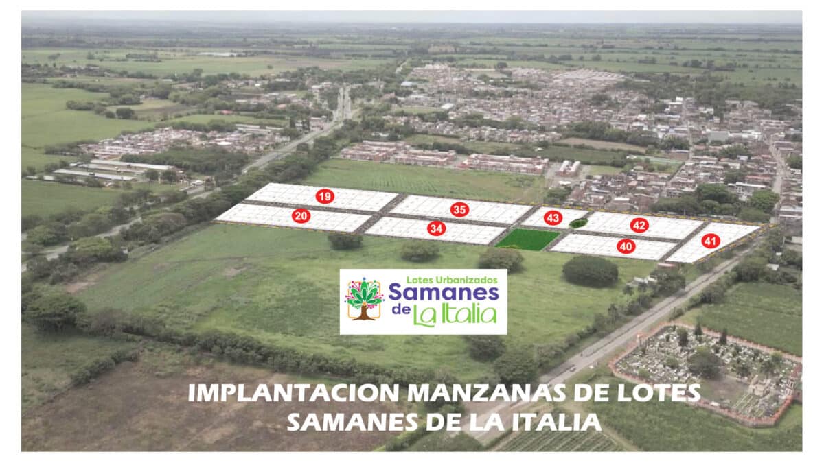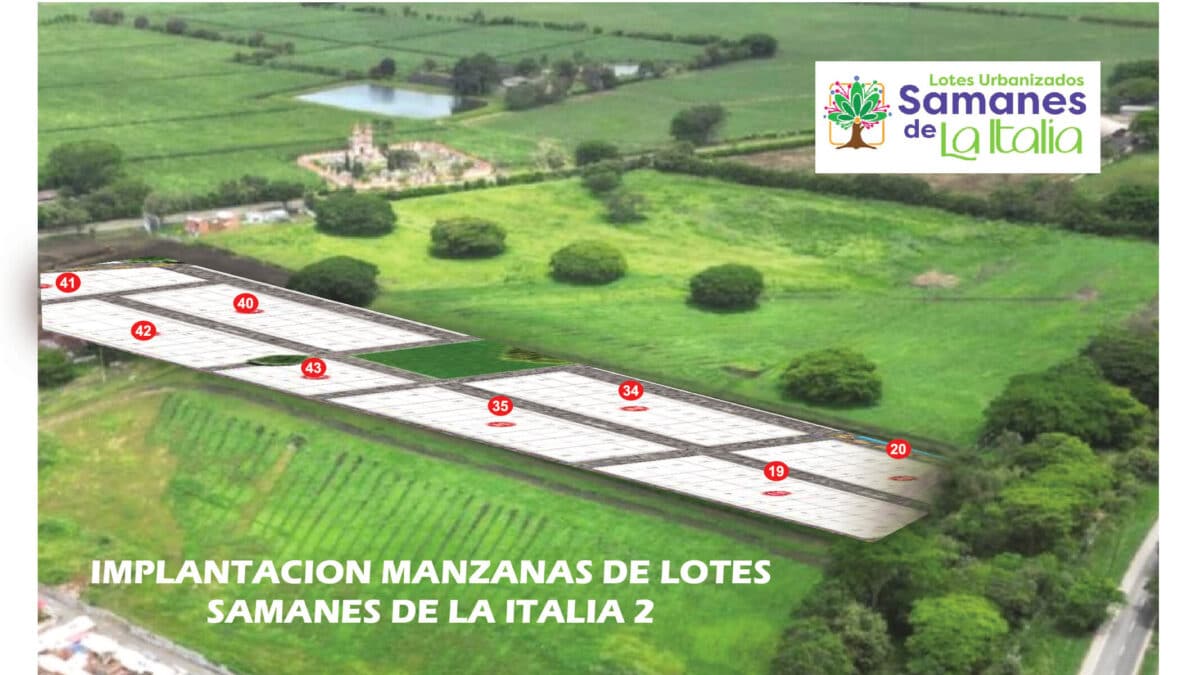 El nuevo desarrollo de lotes Urbanizados SAMANES DE LA ITALIA contara con una oferta inicial de 207 lotes URBANIZADOS con los servicios básicos de Energía, Acueducto y alcantarillado y sus vías totalmente pavimentados. Inicialmente son 8 manzanas en las cuales tendremos la disponibilidad de lotes con Áreas desde los 64.41m2 hasta los 118,14m2 tanto esquineros como Medianeros.